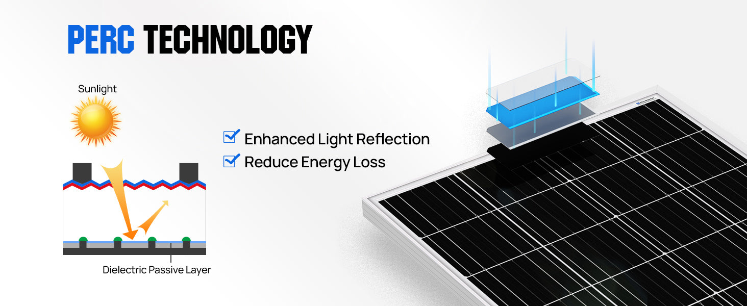 [23% Efficiency] - Providing about 400 wh of electricity per day under standard conditions.PERC technology increases the efficiency of the cell to 23%, using a passivation film to enhance the reflection of sunlight inside the silicon-based substrate,greatly improved the utilization rate of sunlight
