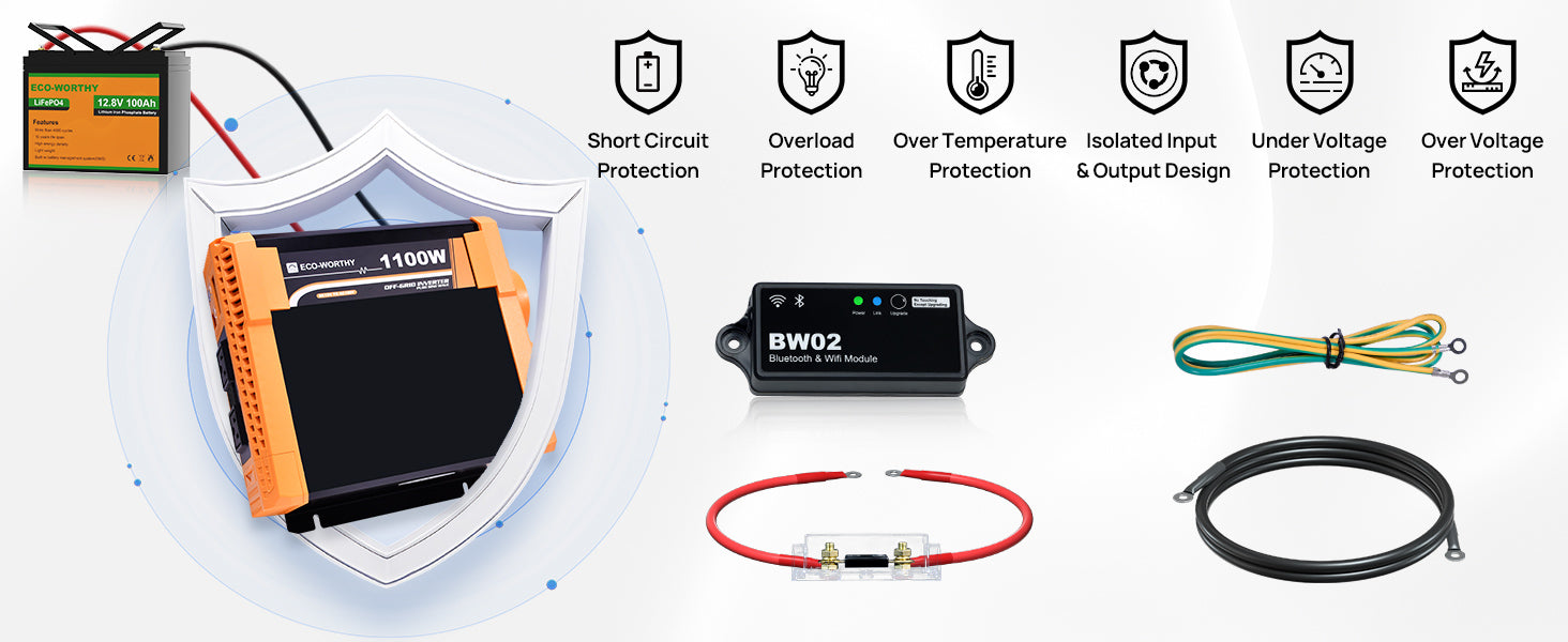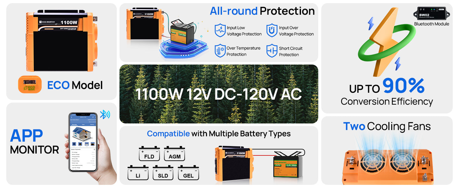 [ Remote-Real-time monitoring systems ]: 1100W inverter with Bluetooth Module, you can monitor the inverter status anytime and anywhere through APP, including battery voltage, output load power, temperature, current and other data.