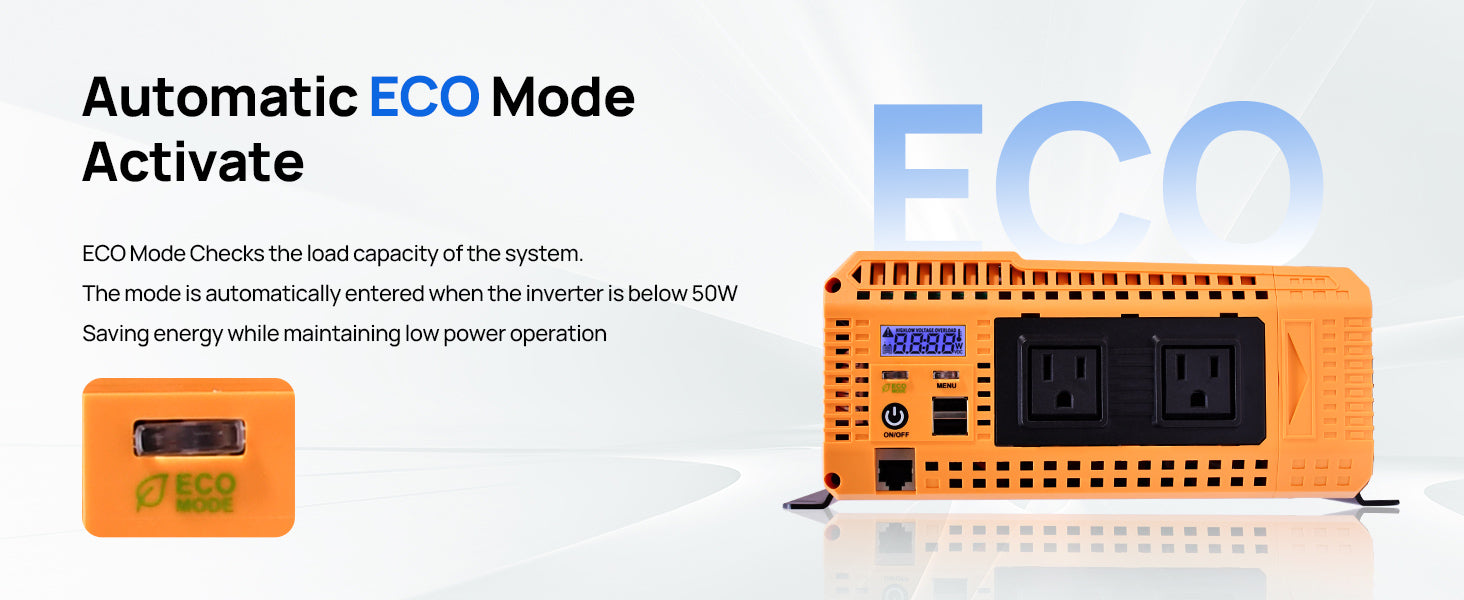 [ ECO MODE ]: Conserving your system's energy.If you turn on ECO MODE, it will automatically enter ultra-low power standby mode when your load power is below 50W and a It will automatically supply power to the load once connected to a device with more than 50 power.