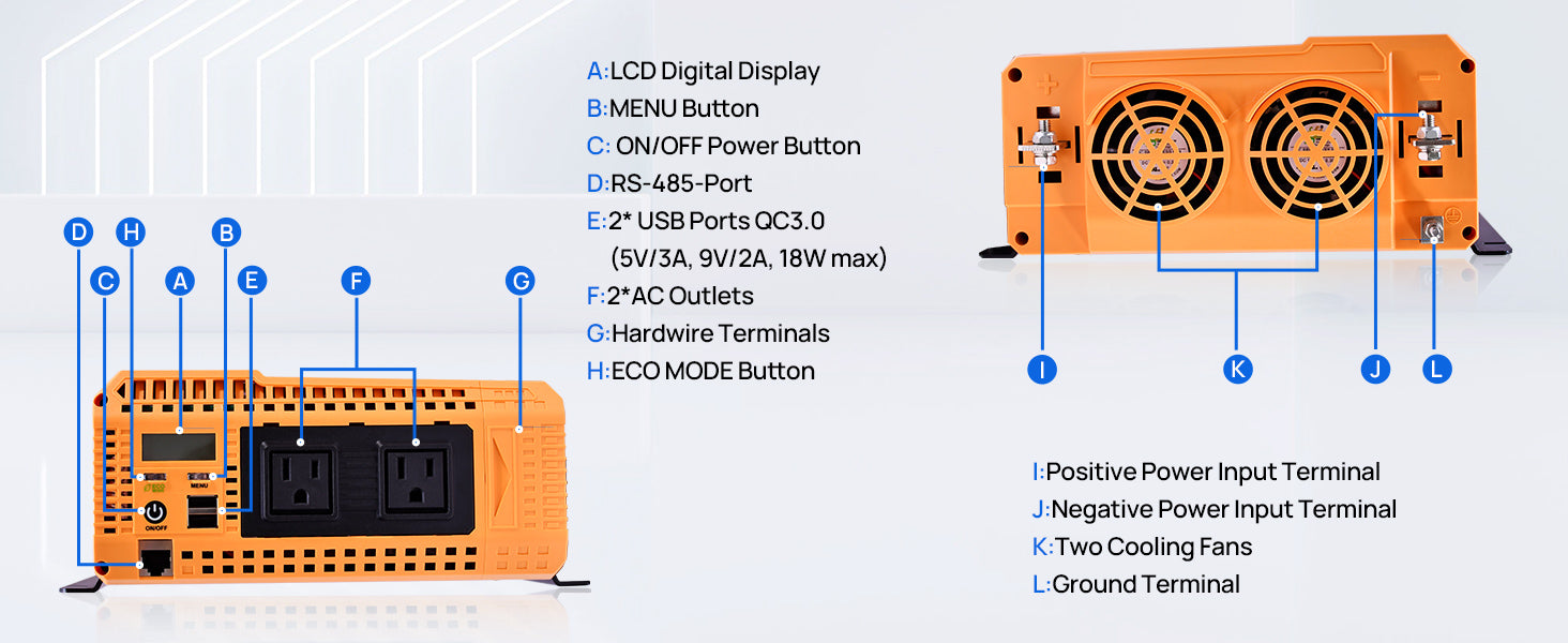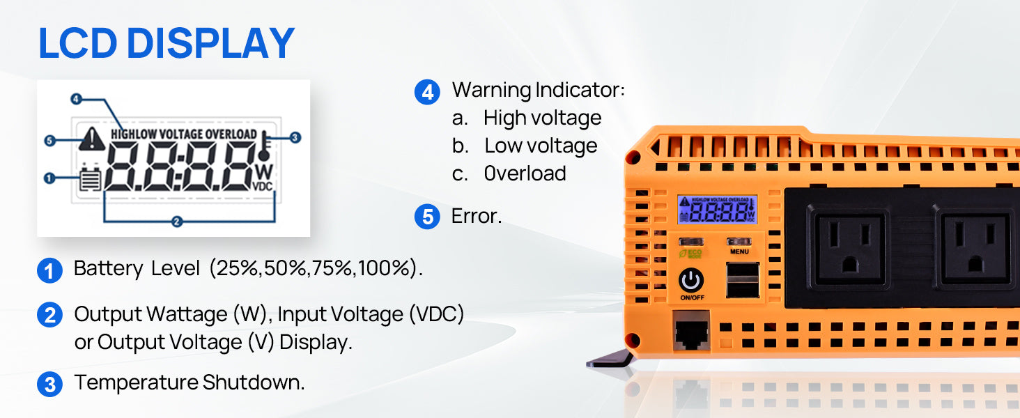 [ Safety Multi-Protection ]: LCD screen with warning message, overload protection,over-voltage protection, the built-in GFCI and double cooling fan,External transparent box with a 100A fuse (replaceable) to ensure heat dissipation and double guarantee your equipment safety.