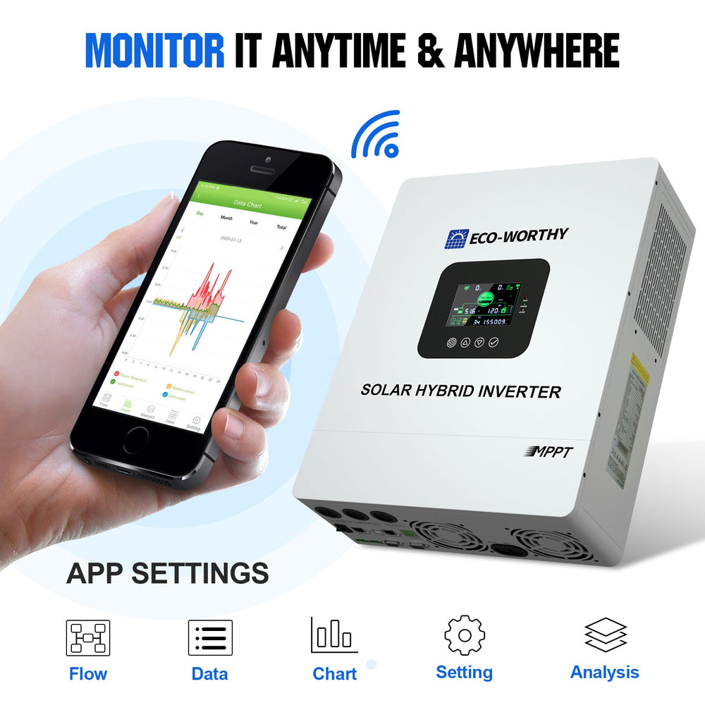 All in one inverter Integrated with 80A/48V MPPT solar charge controller, 5000W pure sine wave inverter in one compact unit to let you enjoy the stable power from the sun and the utility grid to keep you powered under any circumstances.