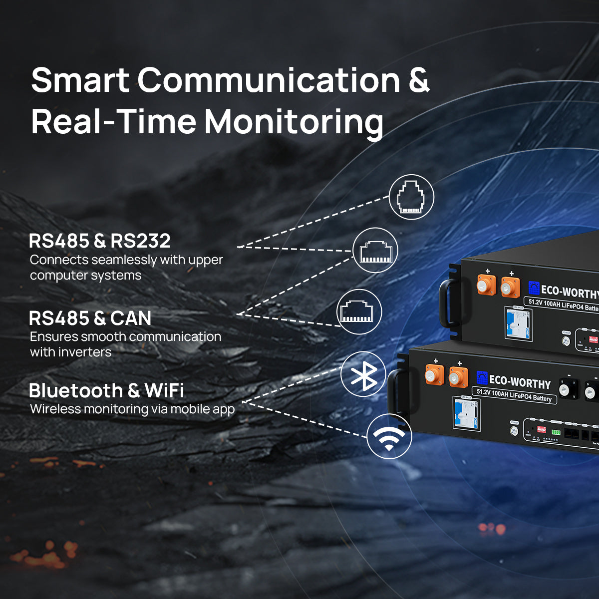 Smart Monitoring, Anytime – Stay in control with real-time status tracking via Bluetooth/WiFi app or CAN/RS485 connection. Works seamlessly with popular all-in-one solar inverters.