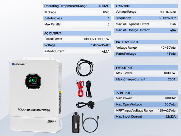 【Parallel Operation & Power Flexibility】 Supports up to 6 units in parallel (max 60kW). Capable of single-phase or split-phase configuration, outputting 110V/220V simultaneously. Battery-free operation mode uses PV DC to power the inverter, ensuring continuous load support.