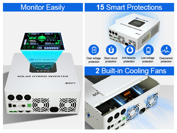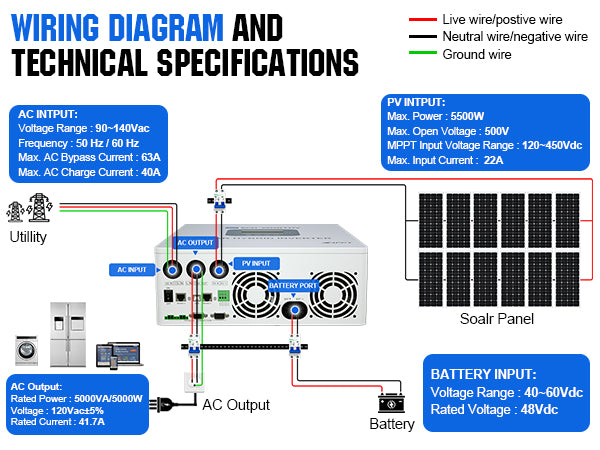 【Smart Charging Management & Compatibility】 Max.PV input power: 5500W, PV input voltage range: 120-500V DC, Max.MPPT Charging Current: 80A, Rated Output Power: 5000W, Max.Peak Power: 10000W, Rated OutputVoltage: 120/240Vac.(split phase/single phase)