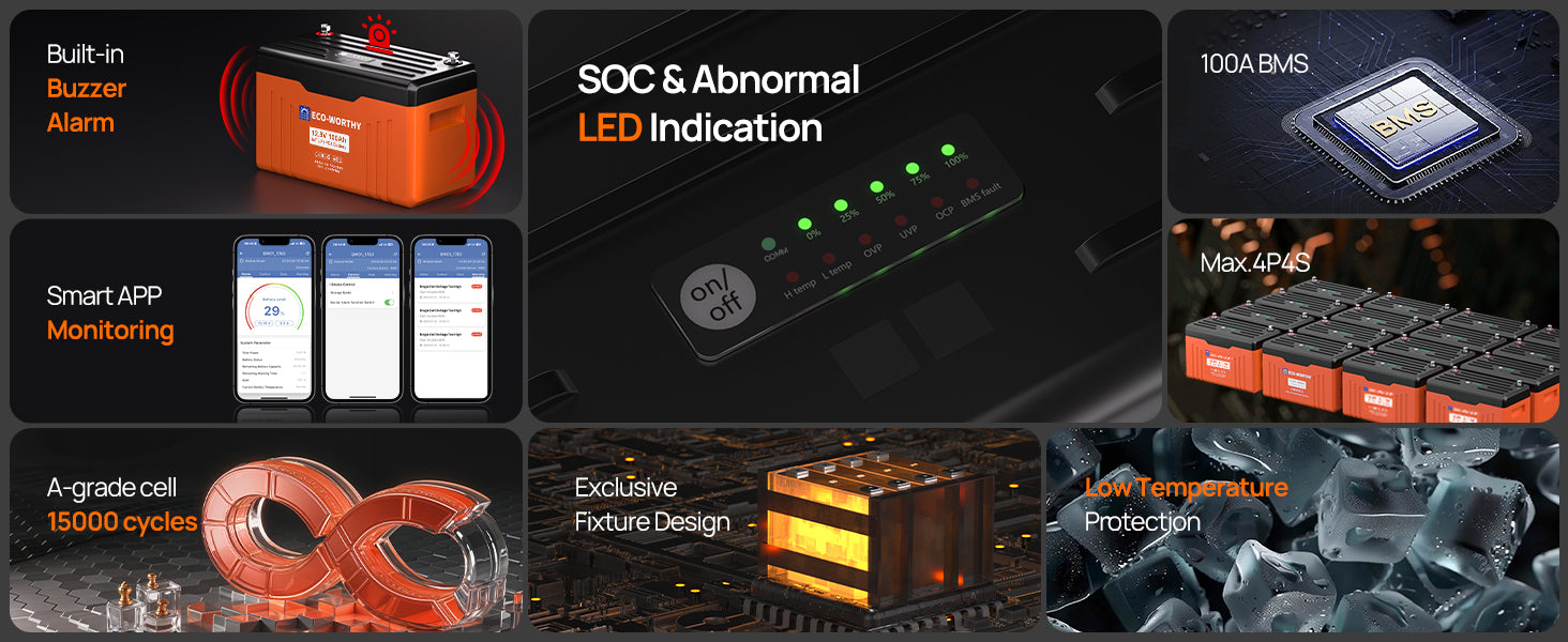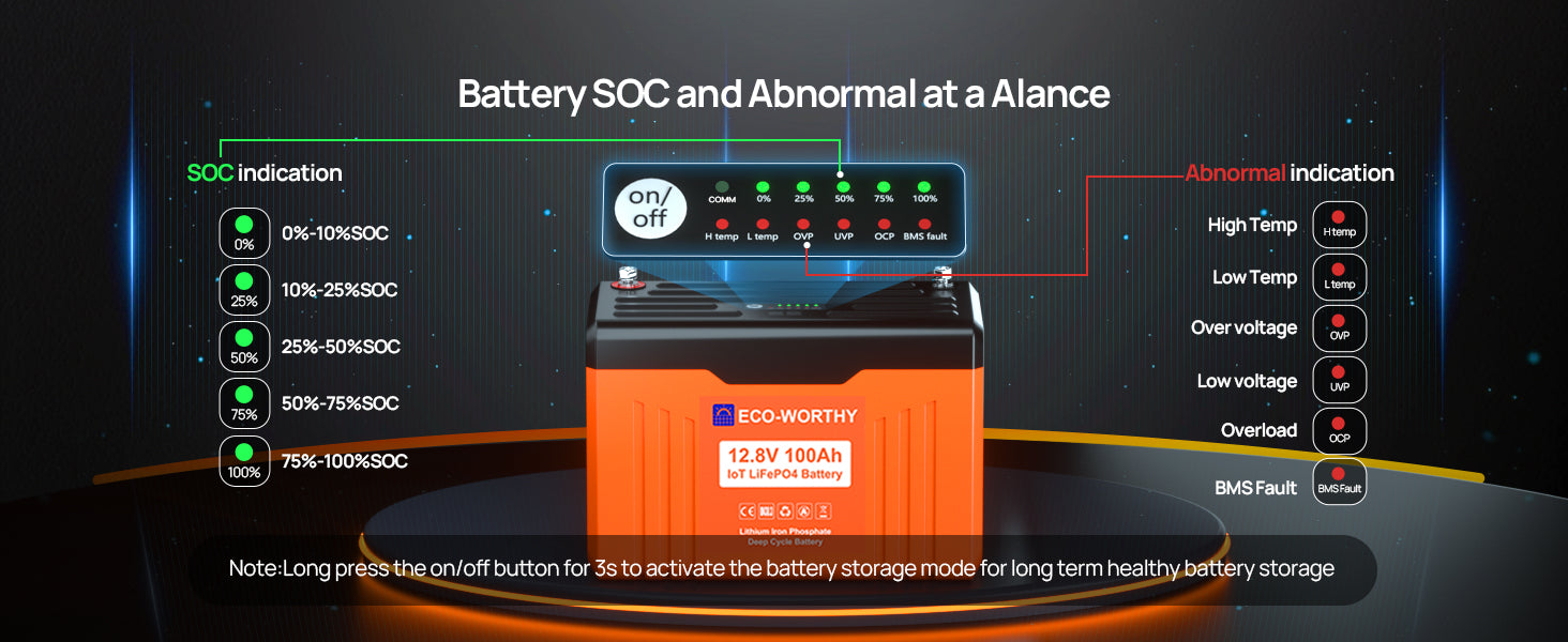 Visual Status Display: ECO-WORTHY 12V 100Ah lithium rv battery features a LED panel that instantly displays battery SOC and abnormals. No APP is needed, you can easily check key information without complex steps