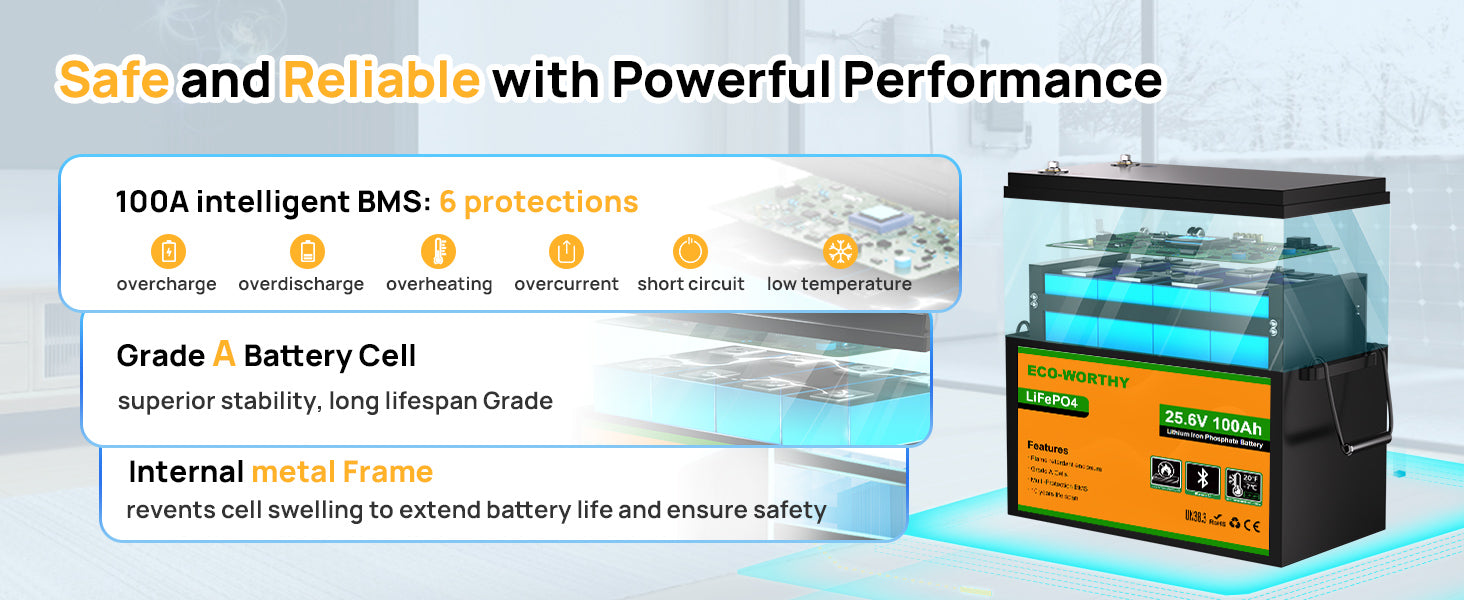 [Expandable Energy] This 24V 100Ah LiFePO4 battery supports flexible expansion with series or parallel connections. By combining up to 2S2P, you can build a higher-capacity battery bank, offering reliable scalability for home solar storage and off-grid power systems