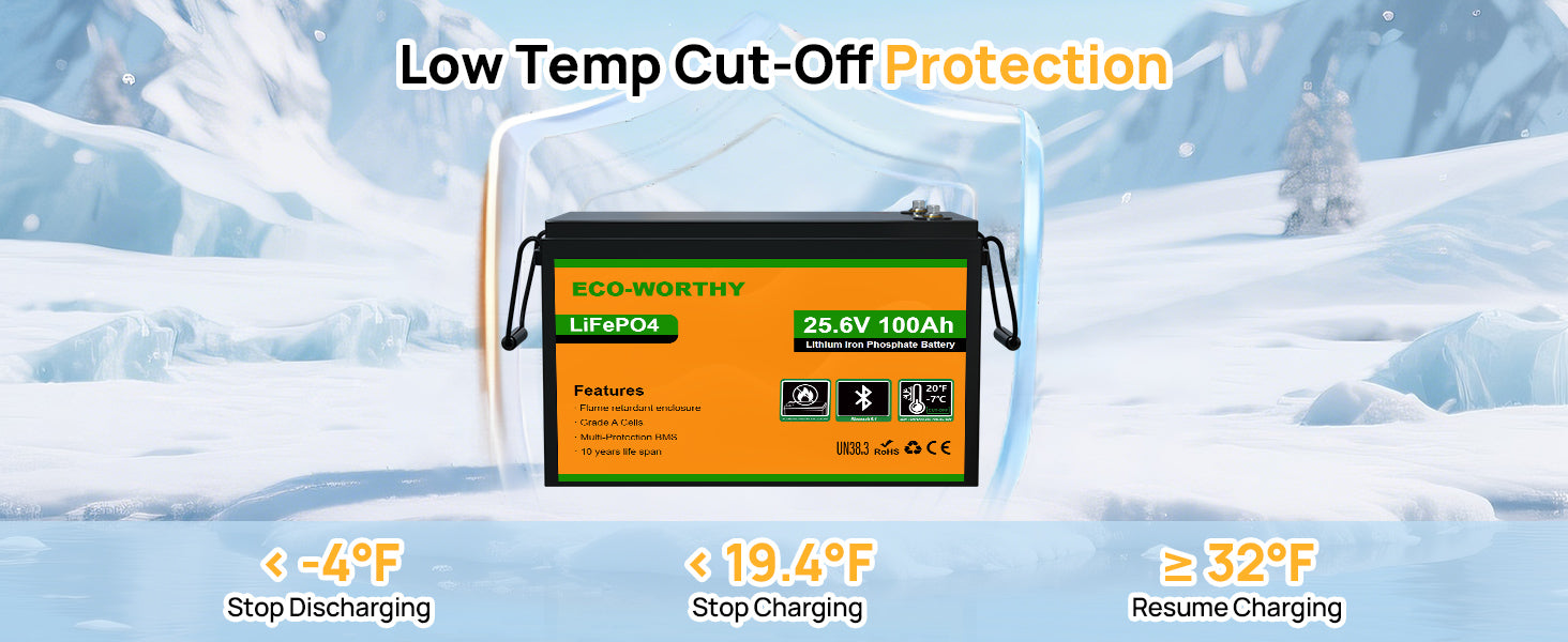 [Enhanced Low-Temperature Protection ] Built-in 100A smart BMS safeguards against overcharge, over-discharge, overcurrent, short circuit, overheating, and now with advanced low-temperature cut-off. This ensures safe and reliable performance even in cold climates, making it ideal for year-round fishing and outdoor use