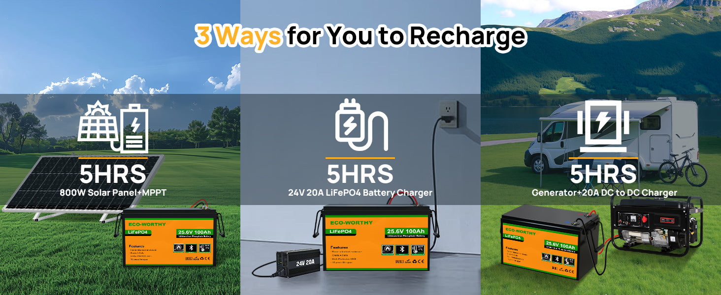 [Compact & Lightweight] ECO-WORTHY 24V 100Ah lithium battery measures only 14.4 x 7.4 x 10.7 inches and weighs just 44.1 lbs—around one-third lighter than traditional lead-acid batteries. Its compact build and high capacity make it perfect for RVs, campers, and solar systems where space matters