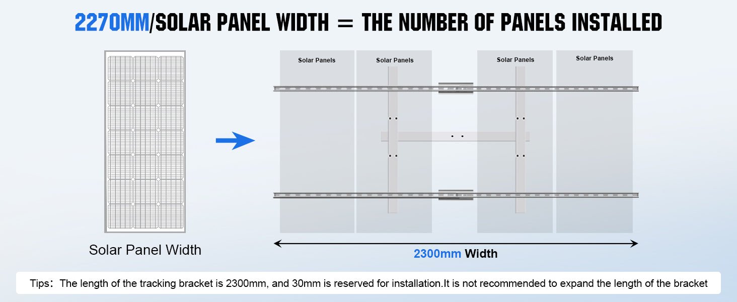 [For different panels] The single-axis tracking racking system is also suitable for different sizes of solar panels.Up to 4 panels can be installed when width of each is less than 22in.Up to 3 panels can be installed when width of each is less than 29.5in.Up to 2 panels can be installed when width of each is less than 44.8in.You can install the board according to the actual needs.