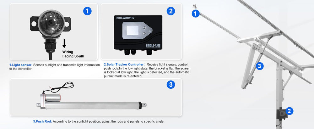 [Easy to use] The setup is very easy, you only need to operate the controller to complete the control of the single axis tracking bracket system.SET Button-Automatically track the solar mode ,FLAT(M)Button-Automatic flat bracket mode.