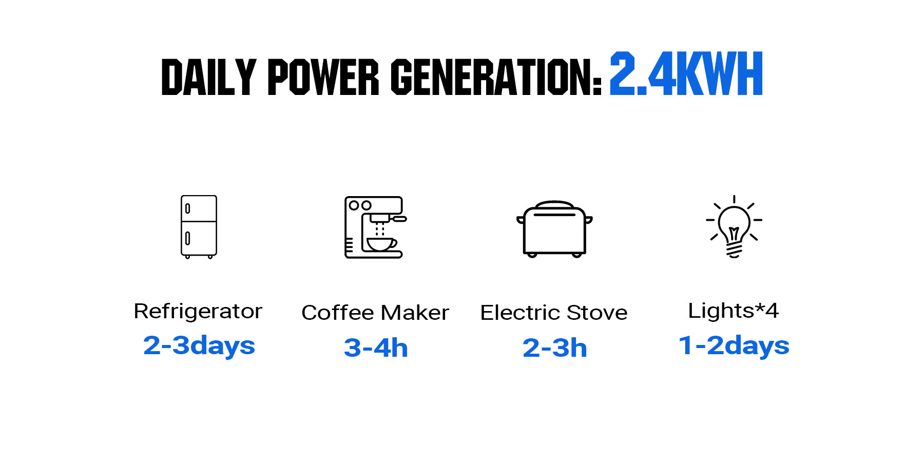 For a typical 20' classic travel trailer, it usually takes about 1.5-3kwh electricity per day, for fridge, TV, coffee maker and lights.