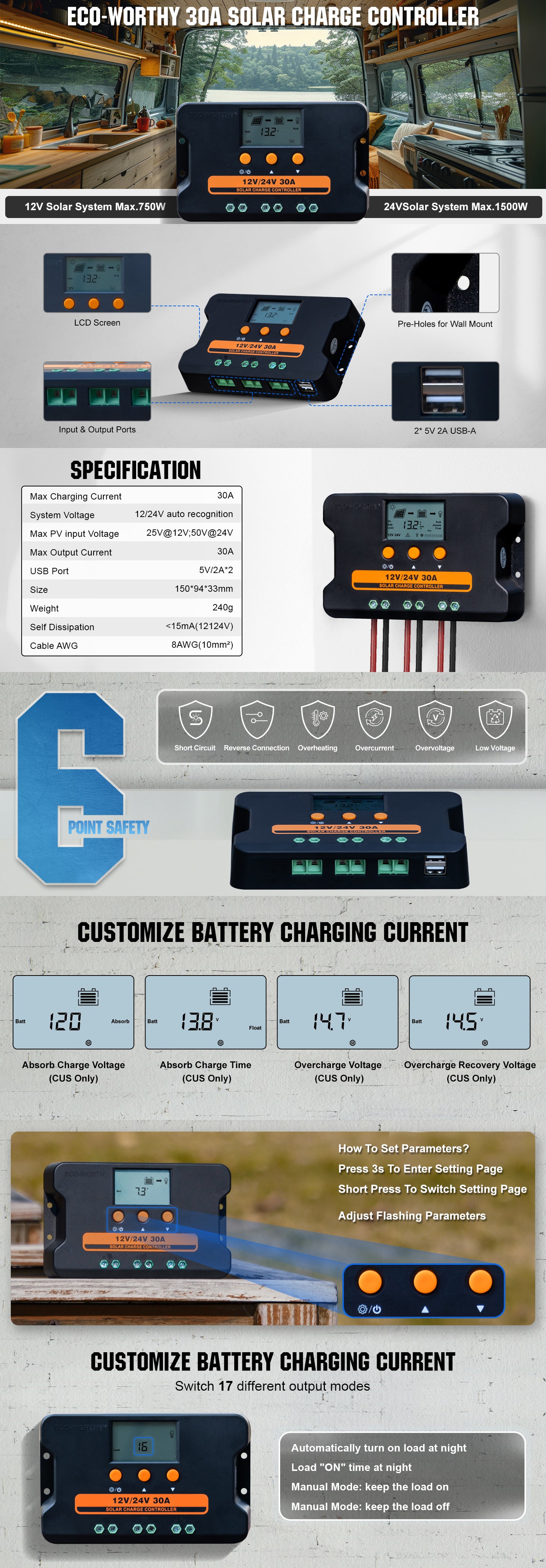 ·Intelligent 3-Level PWM Charging: Full three-level PWM intelligent charging management (bulk, absorber, float), and multiple intelligent protections against reverse, short circuit, overcurrent, low/high voltage, overheating. Improving system efficiency and performance, extending battery lifespan.